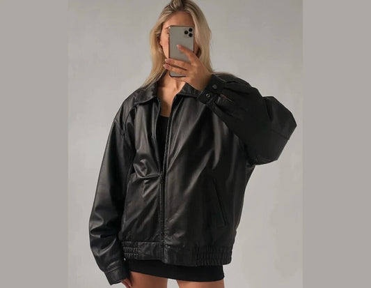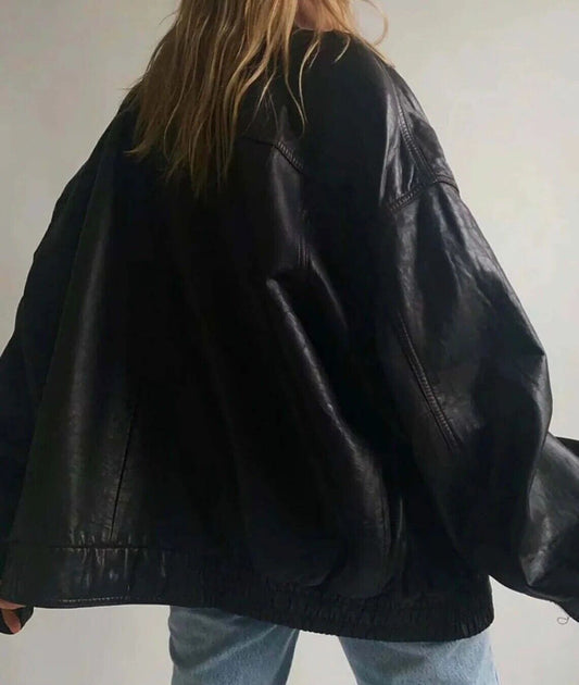 90's Women's Handmade Oversized Real Leather Black Bomber Jacket