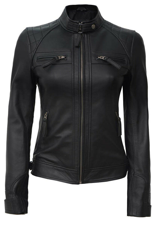 Ladies Women's Black Slim Fit Biker Lambskin Leather Designer Jacket