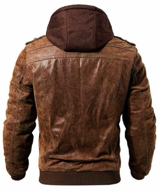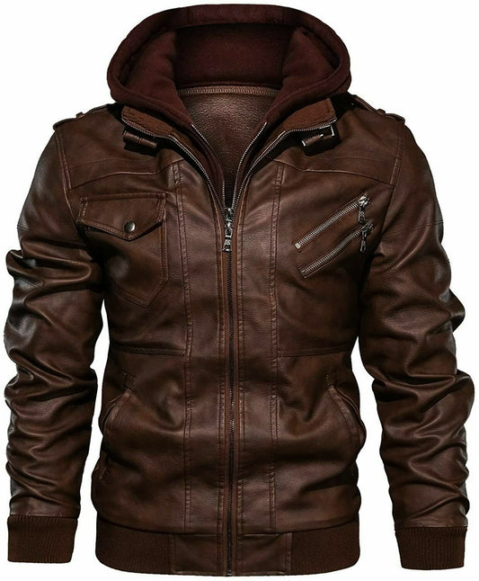 Men's Casual Stand Collar Lambskin Leather Zip-Up Biker Fashion Bomber Jacket Detachable Hood